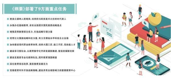 近日,中共中央、国务院印发了《教育强国建设规划纲要(2024—2035年)》(以下简称《纲要》),其中提出,分类推进高校改革发展。实施高等教育综合改革试点。《纲要》明确了到2027年和2035年的主要目标。教育部负责人表示,《纲要》坚持远近结合,分2027年、2035年“两步走”。《纲要》明确到2027年,教育强国建设取得重要阶段性成效。各级教育普及水平持续巩固提升,高质量教育体系初步形成,人民群众教育获得感明显提升,人才自主培养质量全面提高,拔尖创新人才不断涌现,关键领域改革取得实质性进展,教育布局结构与经济社会和人口高质量发展需求更加契合,具有全球影响力的重要教育中心建设迈上新台阶。到2035年,建成教育强国。党对教育事业全面领导的制度体系和工作机制系统完备,高质量教育体系全面建成,基础教育普及水平和质量稳居世界前列,学习型社会全面形成,人民群众教育满意度显著跃升,教育服务国家战略能力显著跃升,教育现代化总体实现。《纲要》部署了9个方面重点任务。在增强高等教育综合实力,打造战略引领力量方面,《纲要》强调,分类推进高校改革发展。实施高等教育综合改革试点。按照研究型、应用型、技能型等基本办学定位,区分综合性、特色化基本方向,明确各类高校发展定位,支持理工农医、人文社科、艺术体育等高校差异化发展。建立分类管理、分类评价机制,在办学条件、招生计划、学位点授权、经费投入等方面分类支持。根据不同类型高校功能定位、实际贡献、特色优势,建立资源配置激励机制,引导高校在不同领域不同赛道发挥优势、办出特色。《纲要》提出,优化高等教育布局。统筹中央部门所属高校和地方高校发展。加大高水平研究型大学建设力度,加快推进地方高校应用型转型。支持部省合建高校加快发展,优化省部共建高校区域布局。新增高等教育资源适度向中西部地区、民族地区倾斜。完善对口支援工作机制。鼓励国外高水平理工类大学来华合作办学。支持高校改善学生宿舍等办学条件。有序扩大优质本科教育招生规模,扩大研究生培养规模,稳步提高博士研究生占比,大力发展专业学位研究生教育。此外,《纲要》还提出,加快建设中国特色、世界一流的大学和优势学科。围绕中国式现代化的本质要求,自主科学确定“双一流”标准,聚焦优势学科适度扩大“双一流”建设范围。完善质量、特色、贡献导向的监测评价体系,健全动态调整和多元投入机制,加大资源配置力度。完善拔尖创新人才发现和培养机制。《纲要》提出,着力加强创新能力培养,面向中小学生实施科学素养培育“沃土计划”;面向具有创新潜质的高中学生实施“脱颖计划”等。在战略急需和新兴领域,探索国家拔尖创新人才培养新模式。深化新工科、新医科、新农科、新文科建设,强化科技教育和人文教育协同,推进理工结合、工工贯通、医工融合、农工交叉,建强国家卓越工程师学院、国家产教融合创新平台等,深入实施国家卓越医师人才培养计划。打造一流核心课程、教材、实践项目和师资团队。在培育壮大国家战略科技力量,有力支撑高水平科技自立自强方面,《纲要》指出,实施基础学科和交叉学科突破计划。强化高水平研究型大学国家基础研究主力军和重大科技突破策源地作用,提高基础研究组织化程度,建立科技创新与人才培养相互支撑、带动学科高质量发展的有效机制。打造校企地联合创新平台,加强重大科技基础设施、科技资源库建设,打造一流科技领军人才和创新团队,实现基础学科突破,引领学科交叉融合再创新。此外,《纲要》还明确,探索逐步扩大免费教育范围。教育部负责人表示,为了推动教育强国建设高起点高质量开局起步,教育部正抓紧研究启动加快建设教育强国三年行动计划,开展试点探索,加强监测评价,推动《纲要》重大部署落地落实。举报/反馈